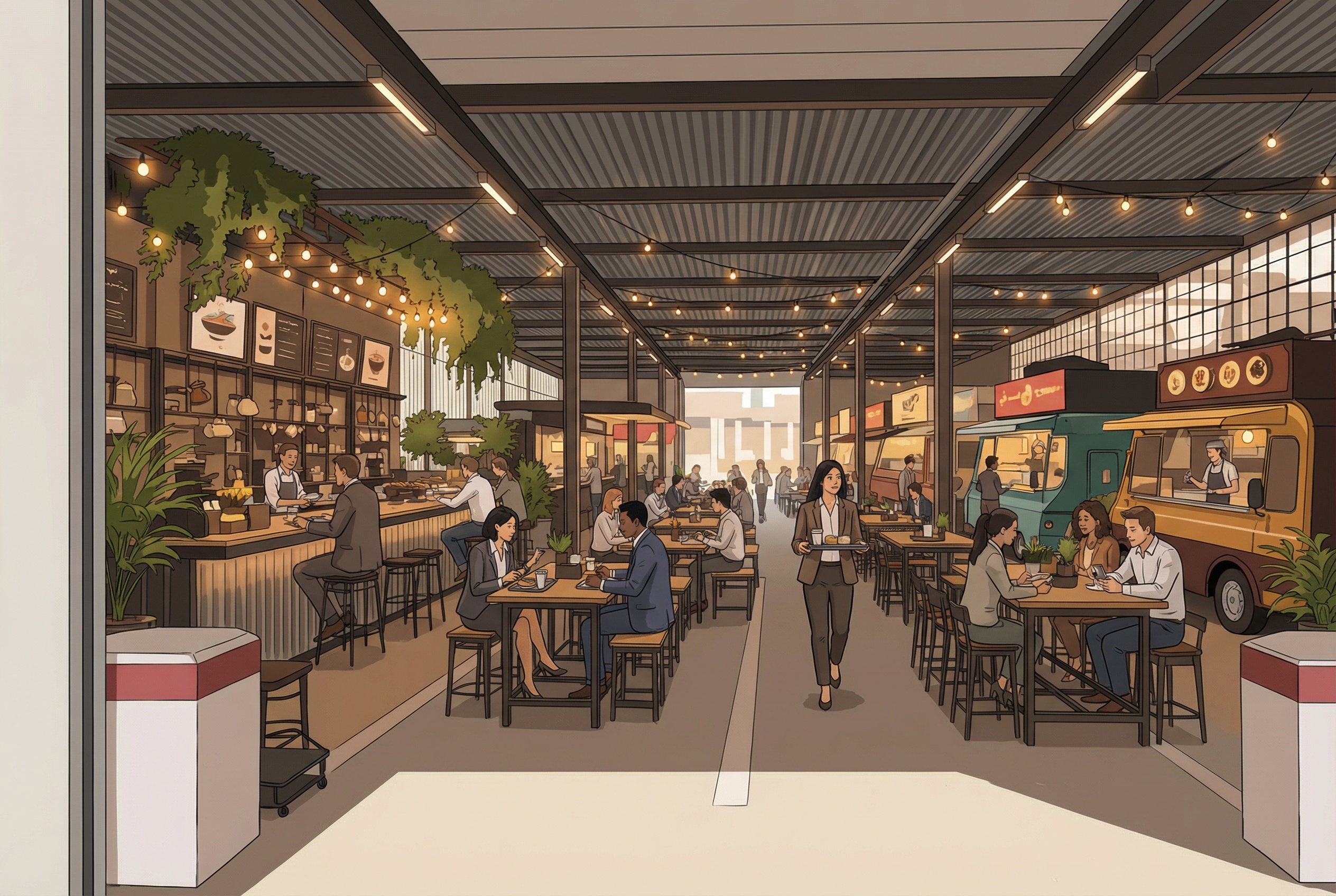 Die Halle soll den nachhaltigen Endausbau des Konzepts bilden – regional verankert und international inspiriert. Die Food Street Halle bildet die Vision, die Umsetzung unterliegt einer Machbarkeitsstudie und resultiert auf den Erfahrungswerten der Lounge Versuchsphase im Aussenbereich.
